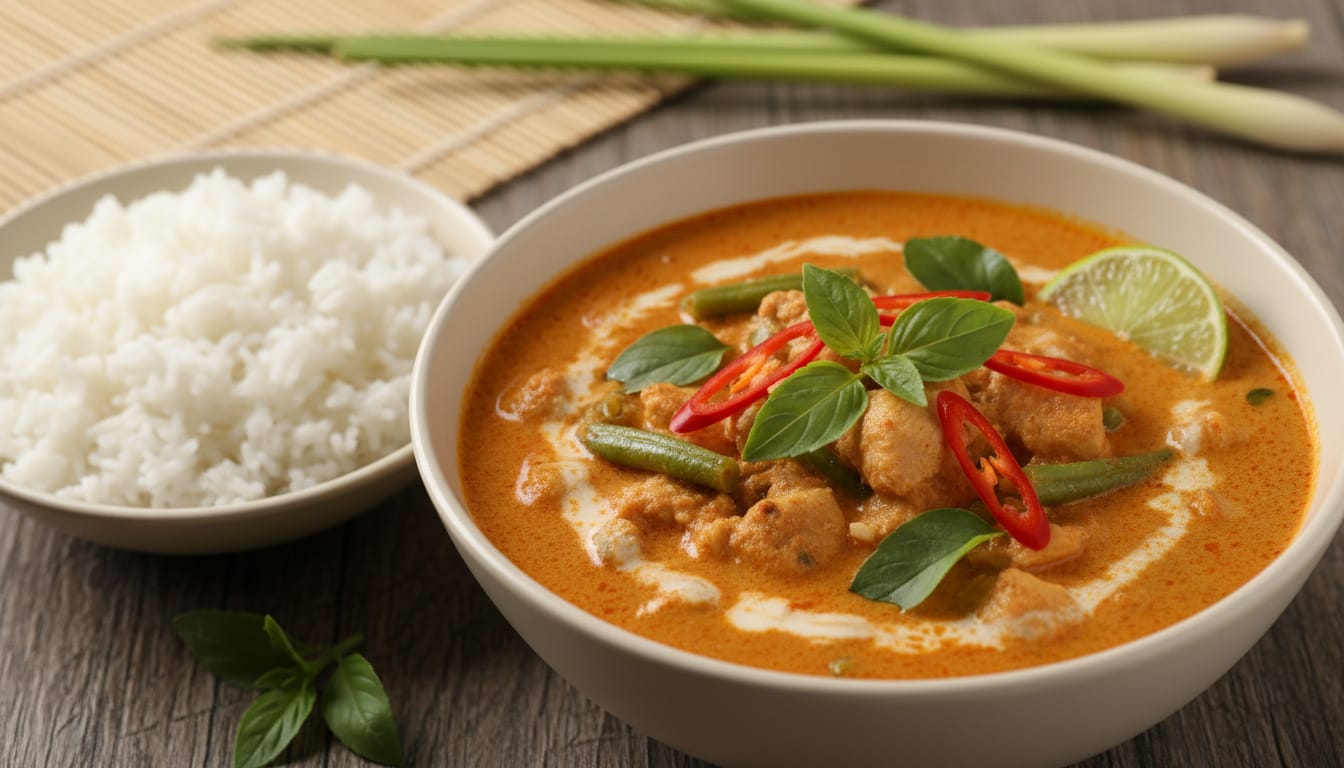 Konačno, ako želite ići kupovnom rutom, ali ne možete pronaći konzerviranu panang pastu od curryja, možete lako pripremiti limenku kupovne paste od crvenog curryja tako da je u mužaru istučete u jednu stabljiku limunske trave, zajedno s istom količinom kikirikija, muškatnog oraščića, sjemenki korijandera, sjemenki kumina i bijelog papra u zrnu koja je navedena u receptu.